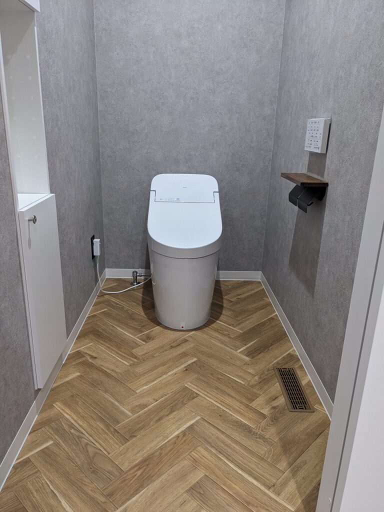 お手洗いは玄関側と寝室側に2カ所設置されました。お手洗いの床にヘリボーン柄、とっても人気です。ヘリンボーン柄(サンゲツ:HM11023(現行:HM12090))がグレーのクロス(サンゲツ:FE76657)ととても良くあっていますね。寝室側のお手洗いは、床をシンプルにして、縦張りの木目調クロス(サンゲツ:PM9803)をアクセントに、シンプルだけどお洒落な空間に仕上がっています。