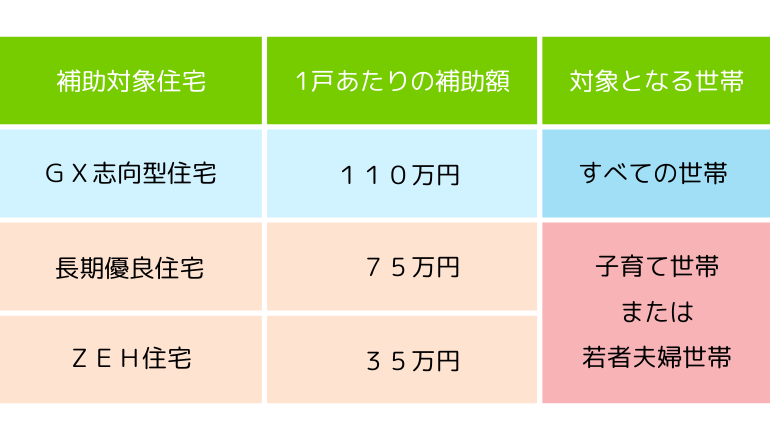 支援対象住宅は3つに分類され、省エネ性能等を有する「ZEH水準住宅」や「長期優良住宅」、昨年より登場した更に高い省エネ性能を有する「GX志向型住宅」に該当する住宅となります。