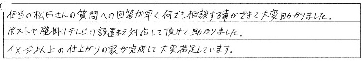 担当の松田さんの質問の回答が早く何でも相談する事ができて大変助かりました。ポストや壁掛けテレビの設置まで対応していただけて助かりました。イメージ以上の仕上がりの家が完成して大変満足しています。