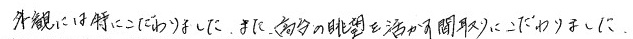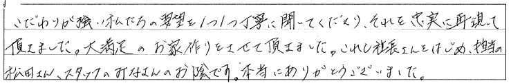 こだわりが強い私たちの要望を一つ一つ丁寧に聞いて下さり、それを忠実に再現していただきました。大満足のお家づくりをさせていただきました。これも社長さんをはじめ、担当の松田さん、スタッフのみなさんのお陰です。本当にありがとうございました。