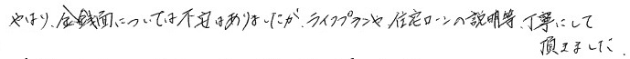 やはり金銭面については不安がありましたが、ライフプランや住宅ローンの説明等、丁寧にしていただきました。