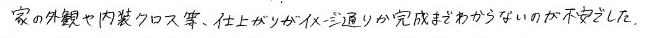 家の外観や内装クロス等、仕上がりがイメージ通りか完成まで分からないのが不安でした。